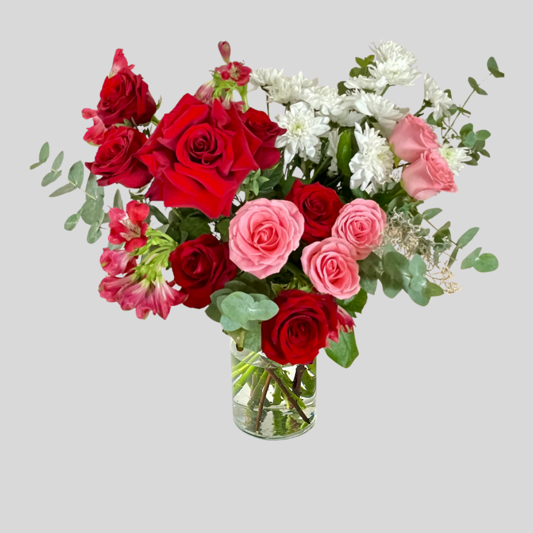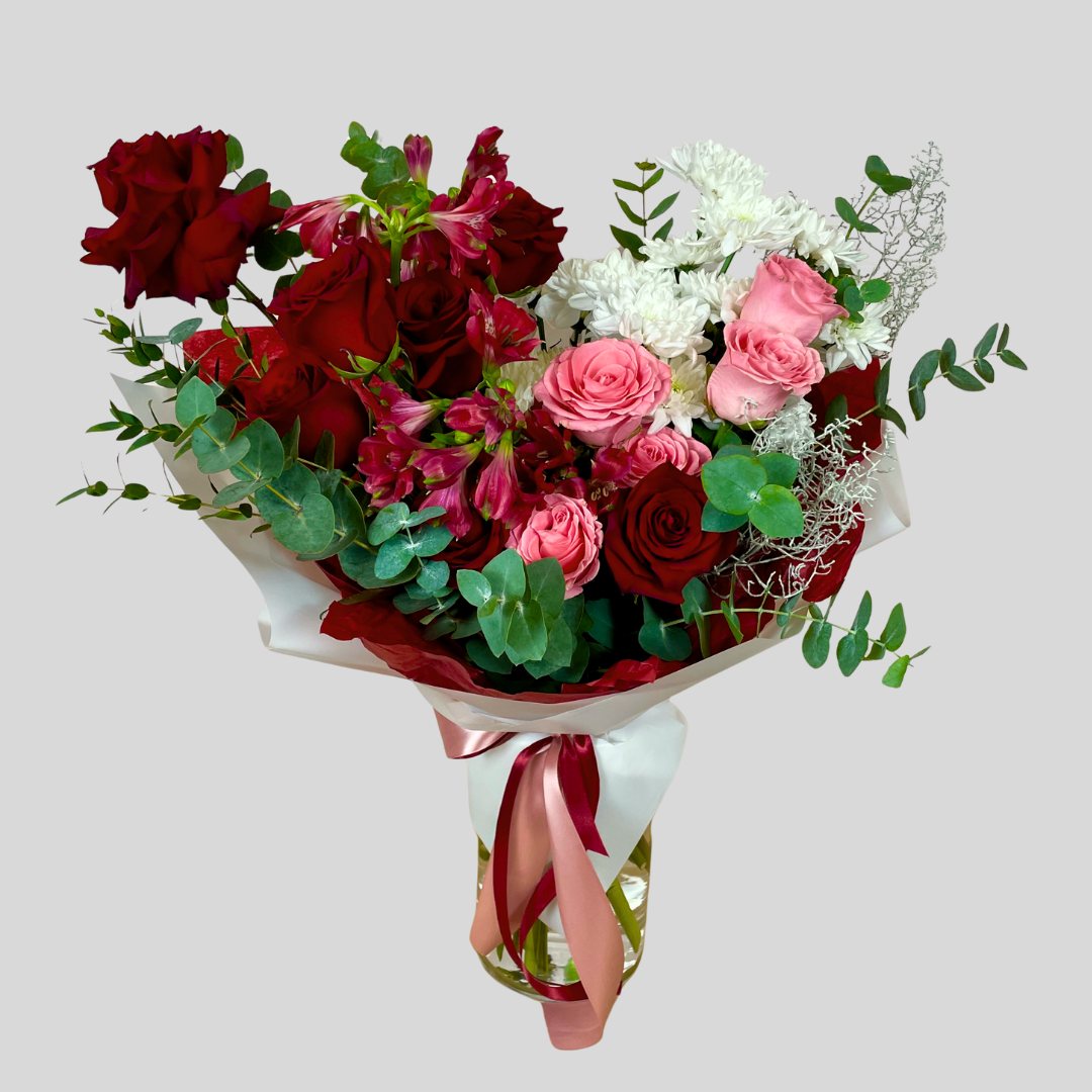Pušķis, kurā pulsē kaisle un maigums. Sarkanās lielziedu rozes simbolizē dziļas jūtas, bet rozā rozes piešķir kompozīcijai vieglumu un romantisku dvesmu. Sarkano alstromēriju rakstainie ziedi kalpo kā ugunīgas dzirkstis, radot dinamisku un neaizmirstamu ziedu dāvanu.